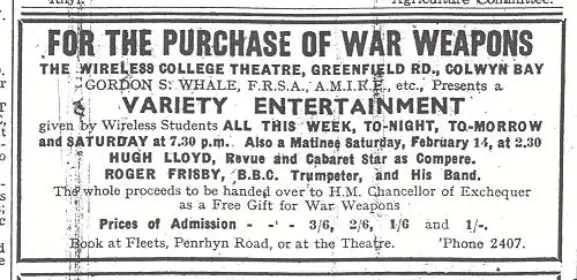 Hugh Lewis Lloyd MBE 22/03/1923 to 14/07/2008His biography on Wikipedia https://en.wikipedia.org/wiki/Hugh_Lloyd doesn’t mention the Wireless Collegebut his name is on the programme below.Jack Edwards made contact with him in 2005 and Hugh confirmed that he was the writer and compere of the 1942 Theatre Show. He asked us for a copy of the programme so we sent one.He had hoped to come to a reunion but wasn’t well enough.