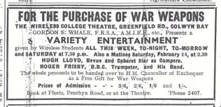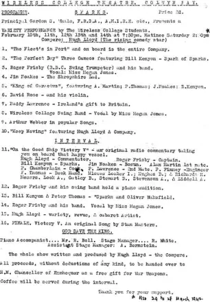 Hugh Lewis Lloyd MBE 22/03/1923 to 14/07/2008His biography on Wikipedia https://en.wikipedia.org/wiki/Hugh_Lloyddoesn’t mention the Wireless Collegebut his name is on the programme below.Jack Edwards made contact with him in 2005 and Hugh confirmed that he was the writer and compere of the 1942 Theatre Show. He asked us for a copy of the programme so we sent one.He had hoped to come to a reunion but wasn’t well enough.